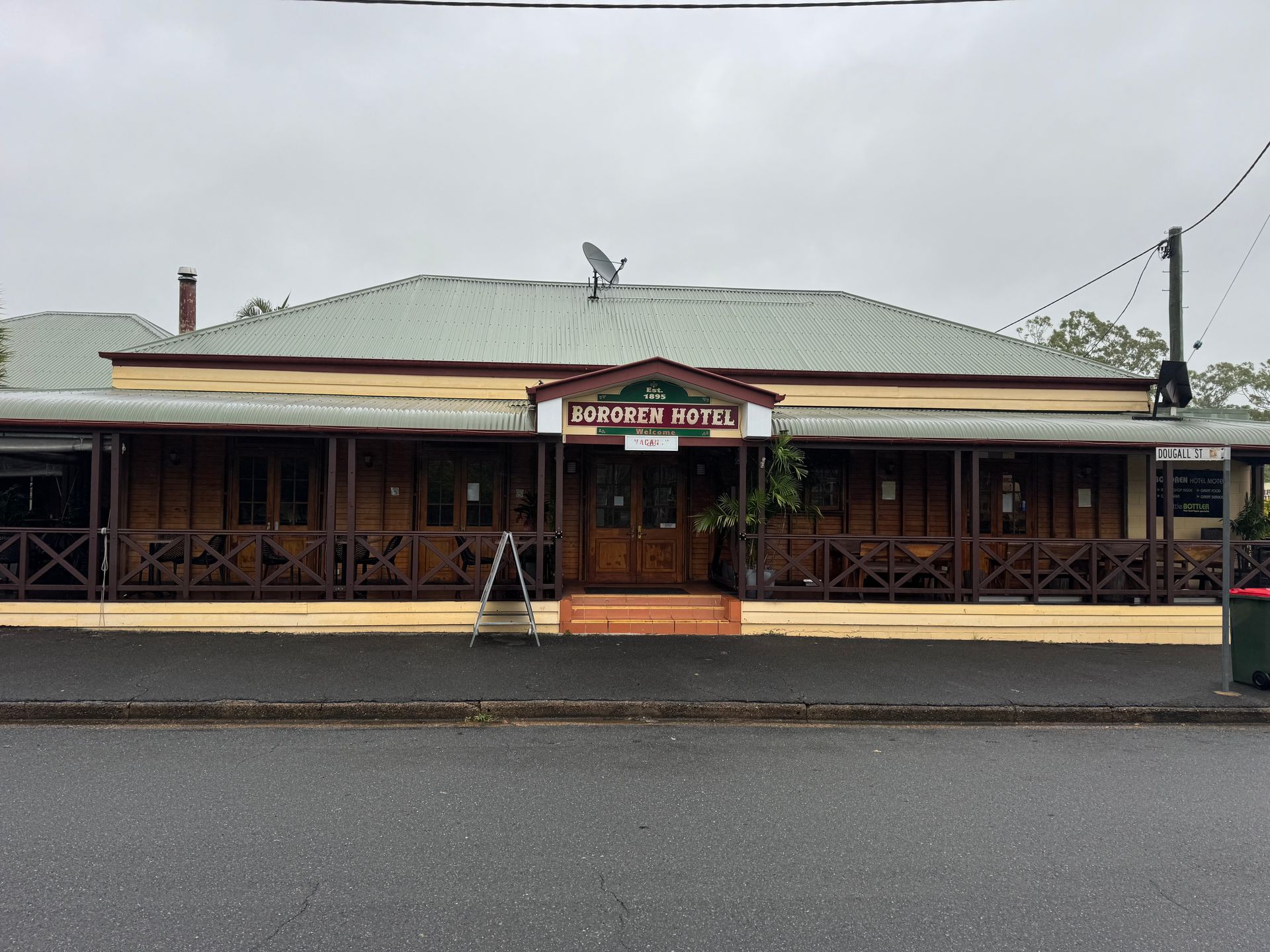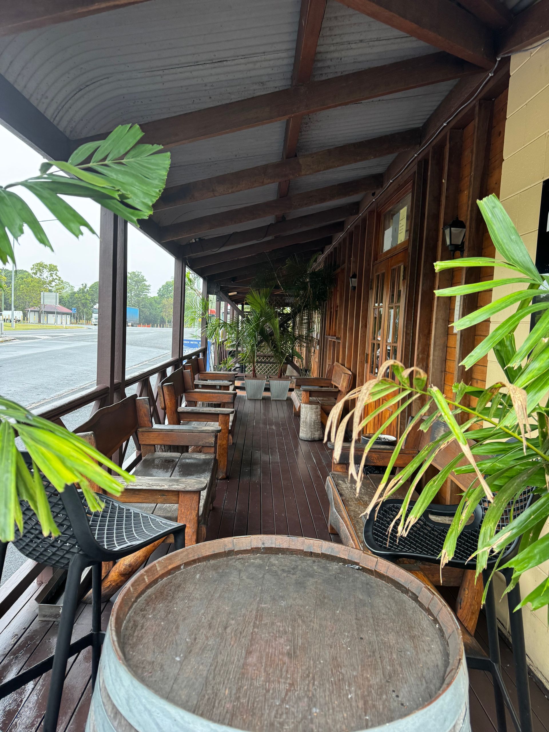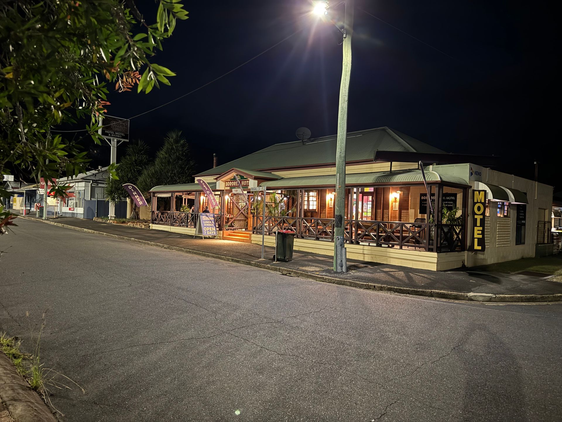 The Bororen Hotel Motel sits on the Bruce Highway south of Gladstone. The hotel is single level brick with quality timber tables & bars, beautiful French doors leading out to the many decks looking over the highway.