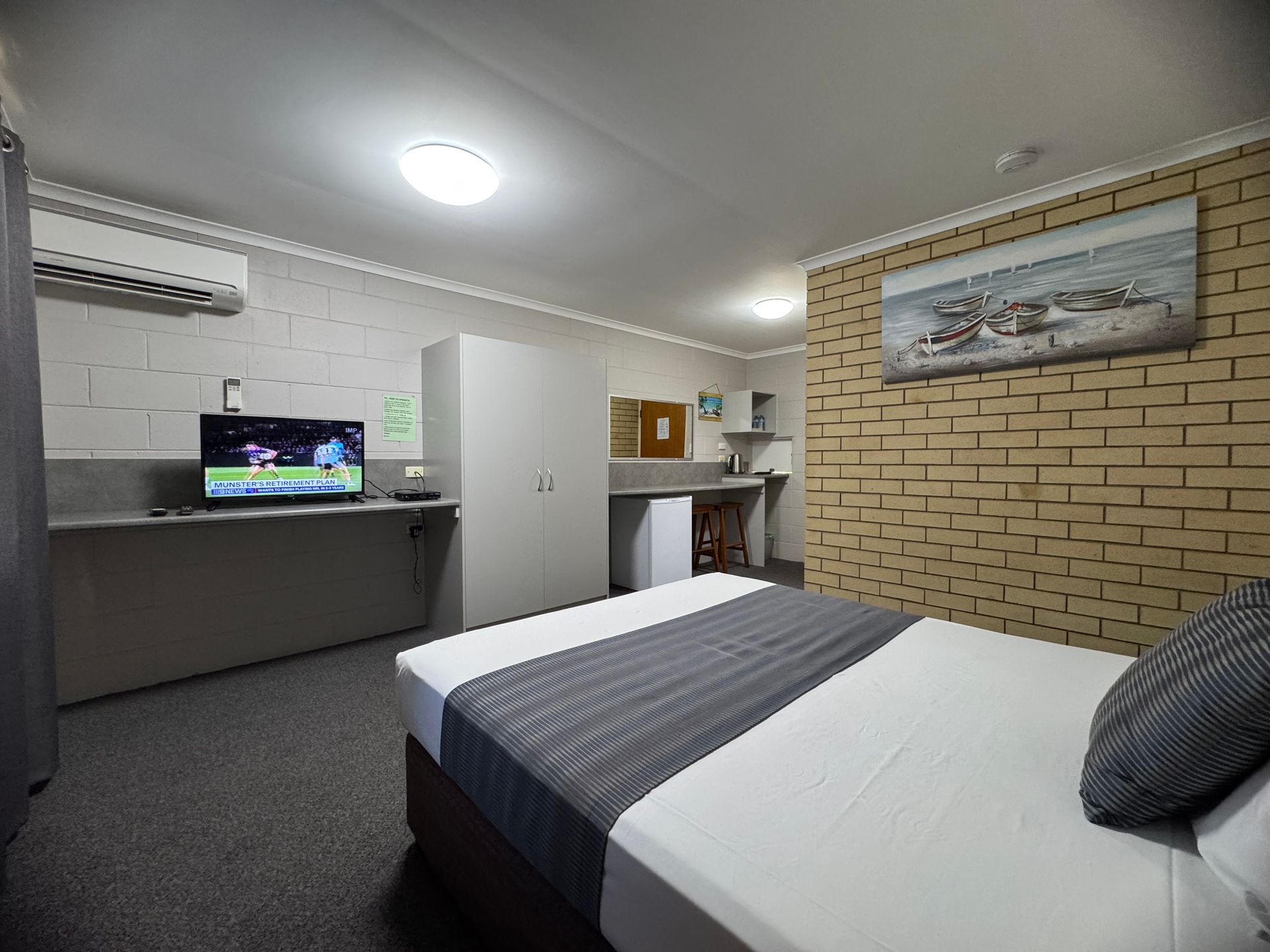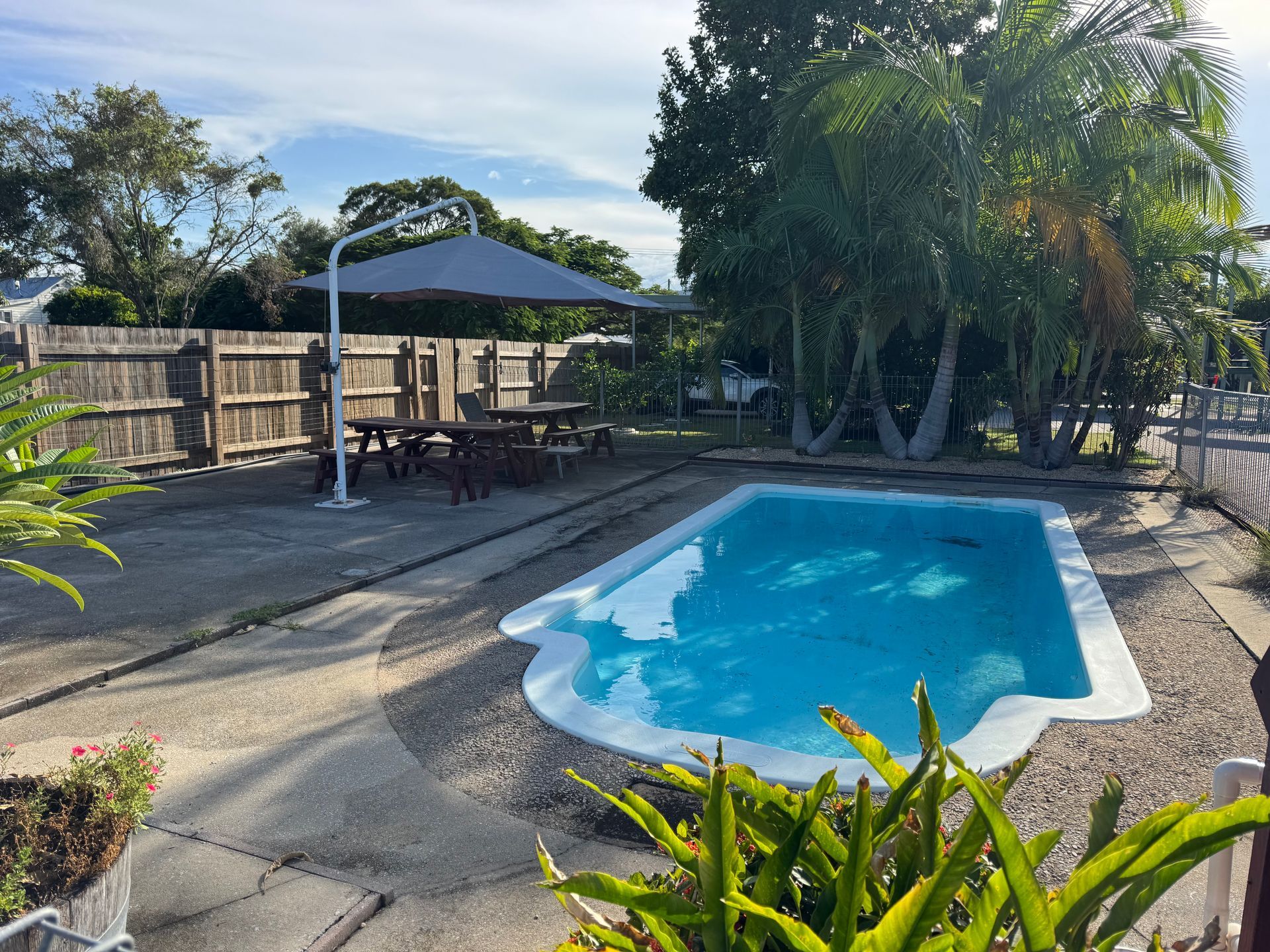The 12 Motel rooms are all air conditioned with TV, Fridge, new ensuite bathrooms. All overlooking the Swimming Pool surrounded by palms and hanging baskets of flowers.